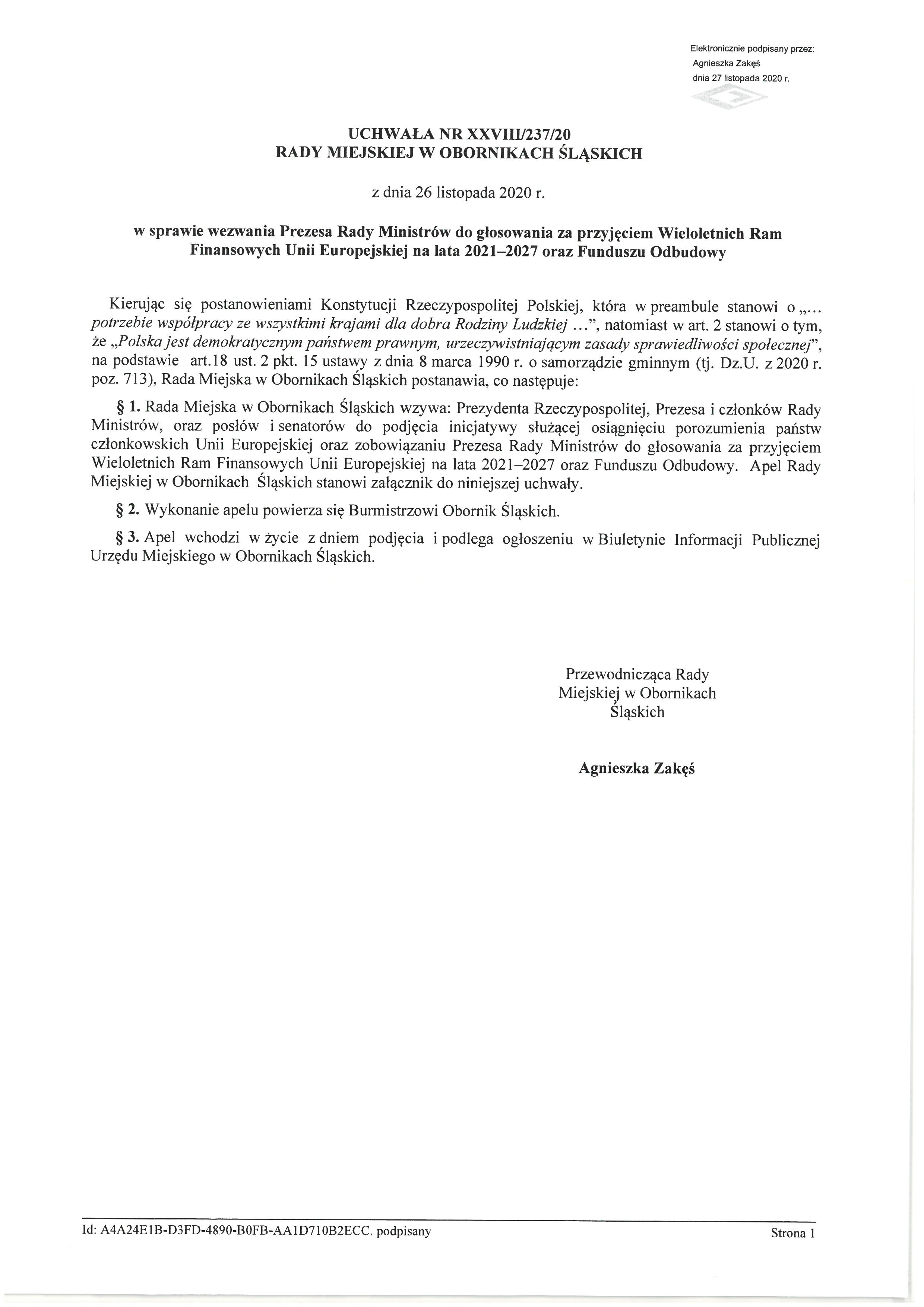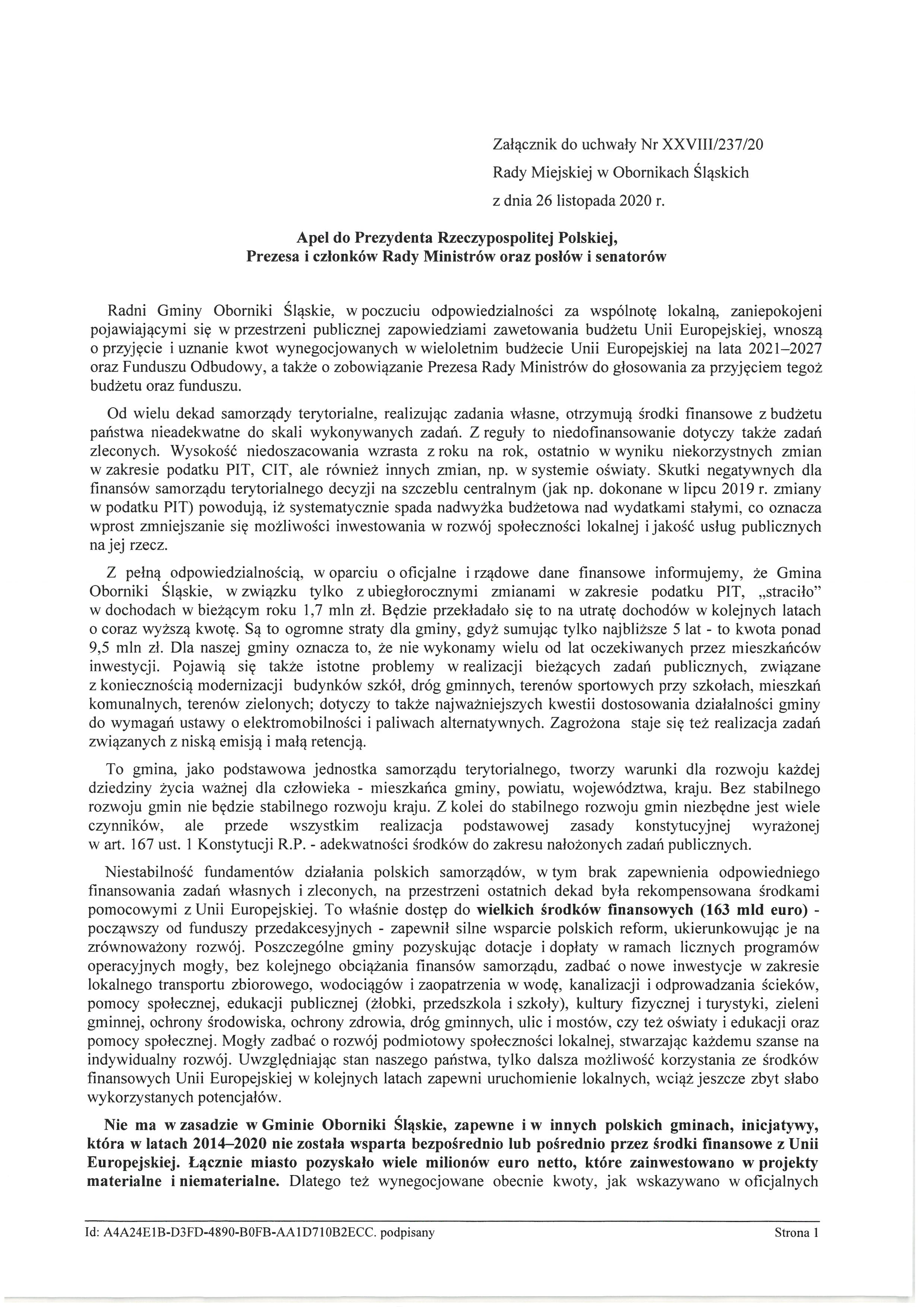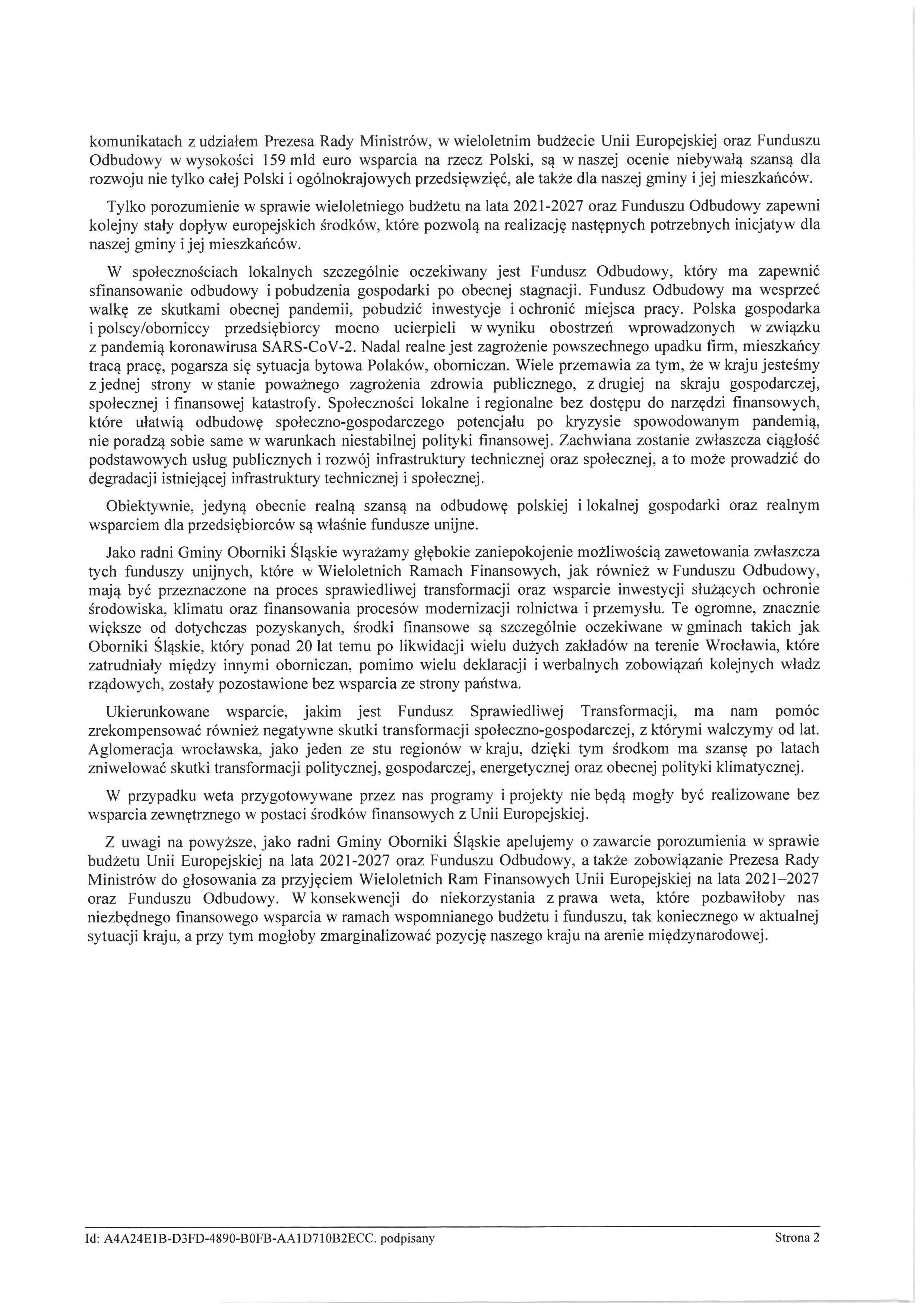 Podczas wczorajszej sesji radni Rady Miejskiej w Obornikach Śląskich zdecydowaną większością głosów przyjęli Apel do Prezydenta Rzeczypospolitej Polskiej, Prezesa i Członków Rady Ministrów oraz parlamentarzystów o przyjęcie i uznanie kwot wynegocjowanych w wieloletnim budżecie Unii Europejskiej na lata 2021-2027 oraz Funduszu Odbudowy, a także o zobowiązanie Prezesa Rady Ministrów do głosowania za przyjęciem tegoż budżetu oraz funduszu.