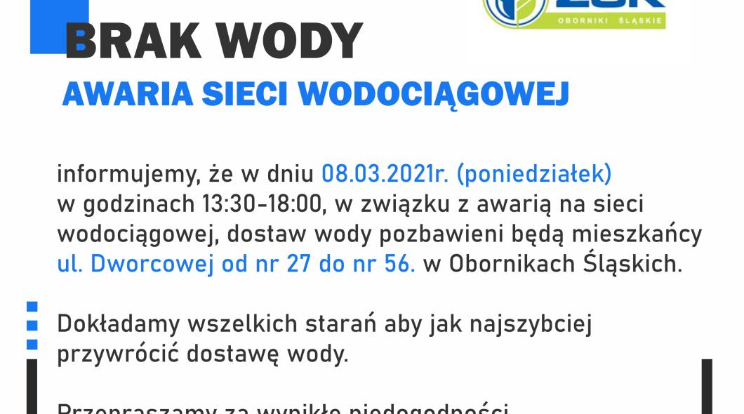 Zakład Gospodarki Komunalnej informuje, że w dniu 08.03.2021r. (poniedziałek) w godzinach 13:30-18:00, w związku z awarią na sieci wodociągowej, dostaw wody pozbawieni będą mieszkańcy ul. Dworcowej od nr 27 do nr 56. w Obornikach Śląskich.