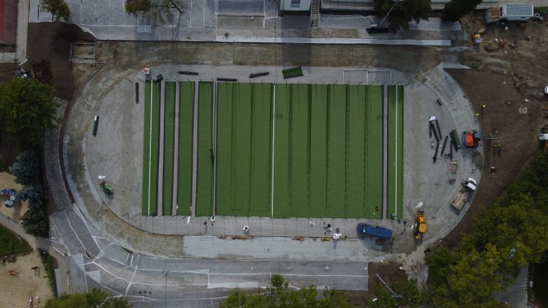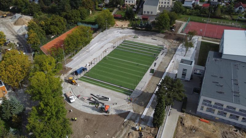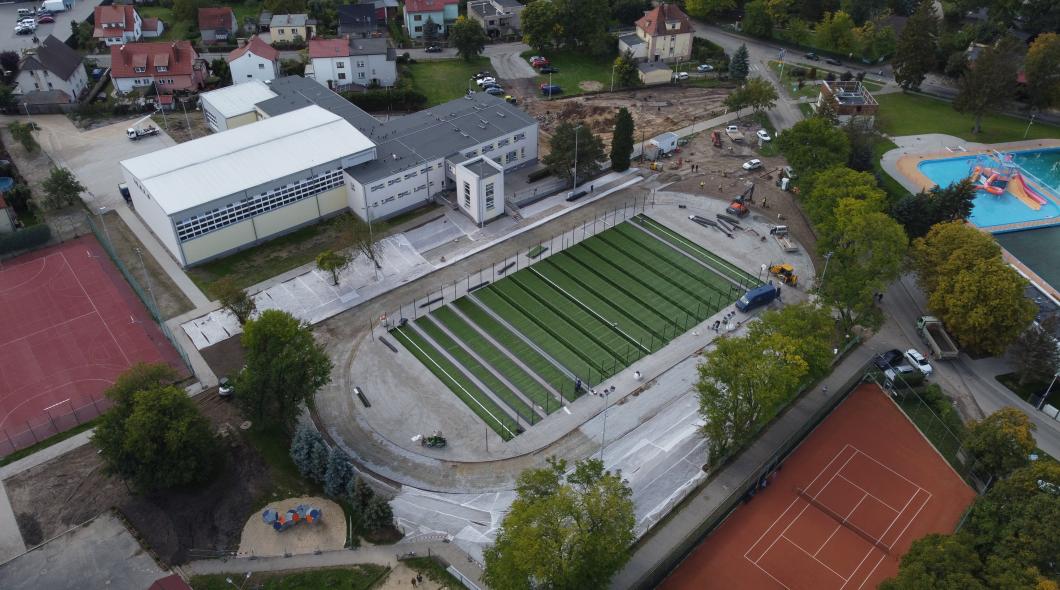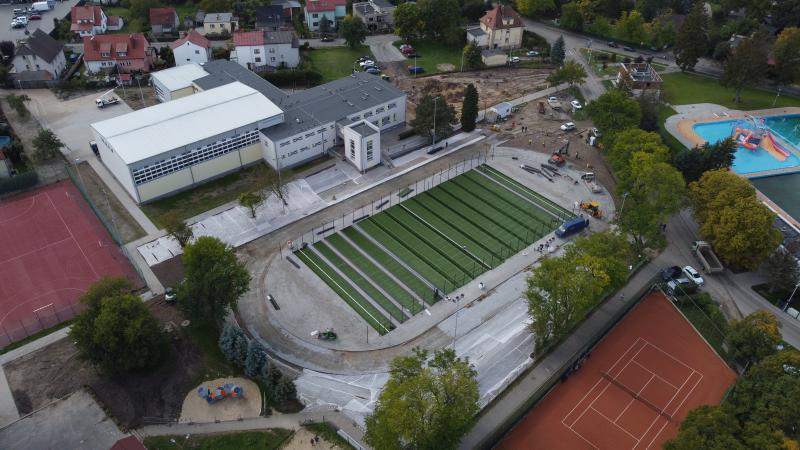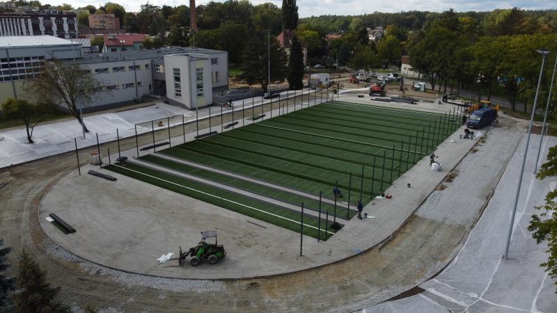 Budowa boiska wielofunkcyjnego przy Ośrodku Sportu i Rekreacji nabiera kolorów. A dokładniej trawy syntetycznej, która jest układana na powierzchni przyszłego boiska. W niedługim czasie zostanie położona bieżnia, która będzie miała długość 200 metrów. Ponadto zostały przebudowane ciągi komunikacyjne na terenie obiektu oraz wybudowana została ścianka wspinaczkowa. Całkowita wartość zadania pt: Sportowe zagospodarowanie terenu wokół OSiR w Obornikach Śląskich to kwota 6 396 000 zł z czego 70% stanowi dofinansowanie z Rządowego Funduszu Polski Ład: Program Inwestycji Strategicznych