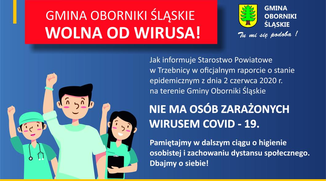 Jak informuje Starostwo Powiatowe w Trzebnicy w oficjalnym raporcie o stanie epidemicznym z dnia 2 czerwca 2020 r. na terenie Gminy Oborniki Śląskie nie ma osób zarażonych wirusem COVID-19. Pamiętajmy w dalszym ciągu o higienie osobistej i zachowaniu dystansu społecznego. Dbajmy o siebie!