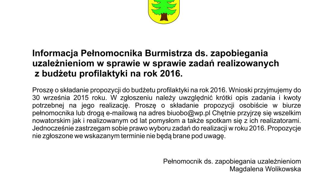 Proszę o składanie propozycji do budżetu profilaktyki na rok 2016. Wnioski przyjmujemy do 30 września 2015 roku. W zgłoszeniu należy uwzględnić krótki opis zadania i kwoty potrzebnej na jego realizację. Proszę o składanie propozycji osobiście w biurze pełnomocnika lub drogą e-mailową na adres biuobo@wp.pl Chętnie przyjrzę się wszelkim nowatorskim jak i realizowanym od lat pomysłom a także spotkam się z ich realizatorami. Jednocześnie zastrzegam sobie prawo wyboru zadań do realizacji w roku 2016. Propozycje nie zgłoszone we wskazanym terminie nie będą brane pod uwagę
