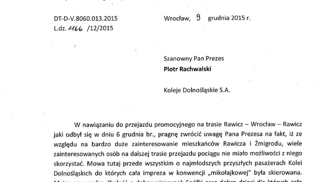 w imieniu Urzędu Marszałkowskiego Województwa Dolnośląskiego zamieszczamy poniżej tekst wyjaśniający utrudnienia podczas mikołajkowego przejazdu promocyjnego Kolei Dolnośląskich w dniu 6 grudnia 2015 roku.