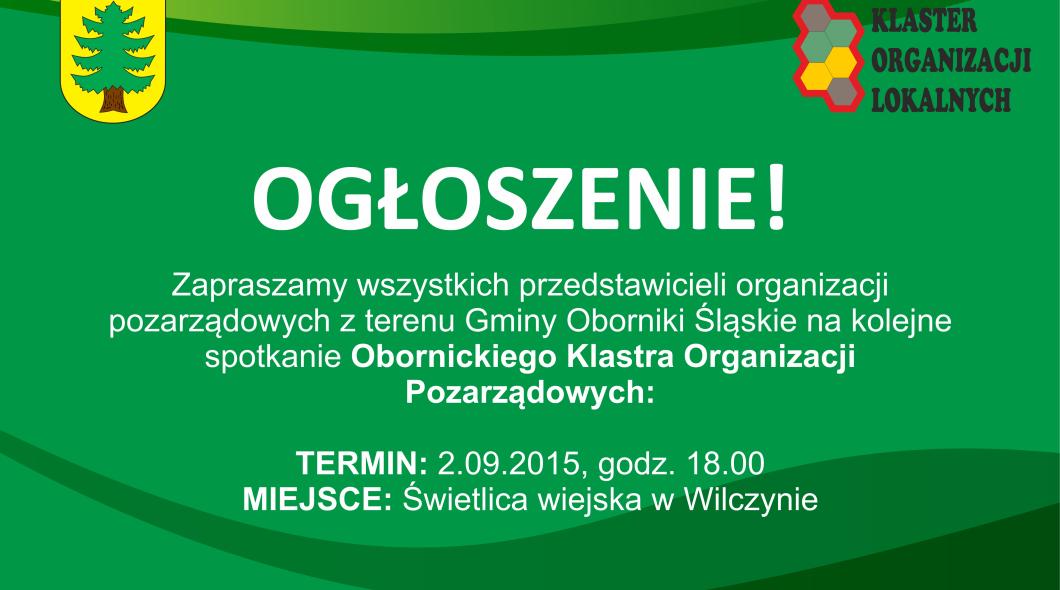 Zapraszamy na kolejne sportkanie Klastra Organizacji Pozarządowych z terenu Gminy Oborniki Śląskie. Termin: 2 września 2015, godz.18.00 w świetlicy wiejskiej w Wilczynie.