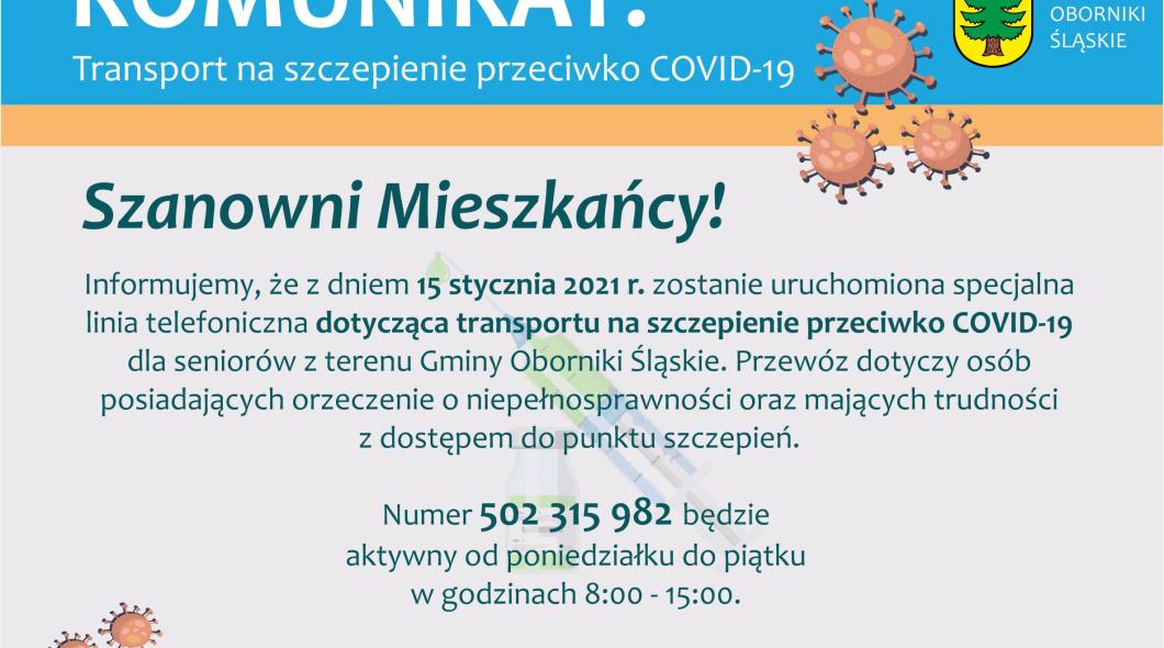 Informujemy, że z dniem 15 styczna 2021 r. zostanie uruchomiona specjalna linia telefoniczna dotycząca transportu na szczepienie przeciwko COVID-19 dla seniorów z terenu Gminy Oborniki Śląskie. Przewóz dotyczy osób posiadających orzeczenie o niepełnosprawności oraz mających trudności