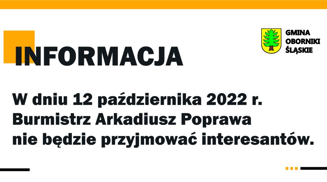infomujemy, że Burmistrz Obornik Śląskich Arkadiusz Poprawa w dniu 12 października 2022 r. nie będzie przyjmować interesantów.