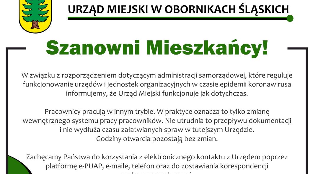 Komunikat dotyczący pracy Urzędu Miejskiego | Oficjalny serwis Gminy Oborniki Śląskie