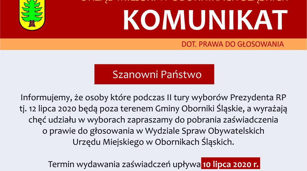 Informujemy, że osoby które podczas II tury wyborów Prezydenta RP tj. 12 lipca 2020 będą poza terenem Gminy Oborniki Śląskie, a wyrażają chęć udziału w wyborach zapraszamy do pobrania zaświadczenia o prawie do głosowania w Wydziale Spraw Obywatelskich