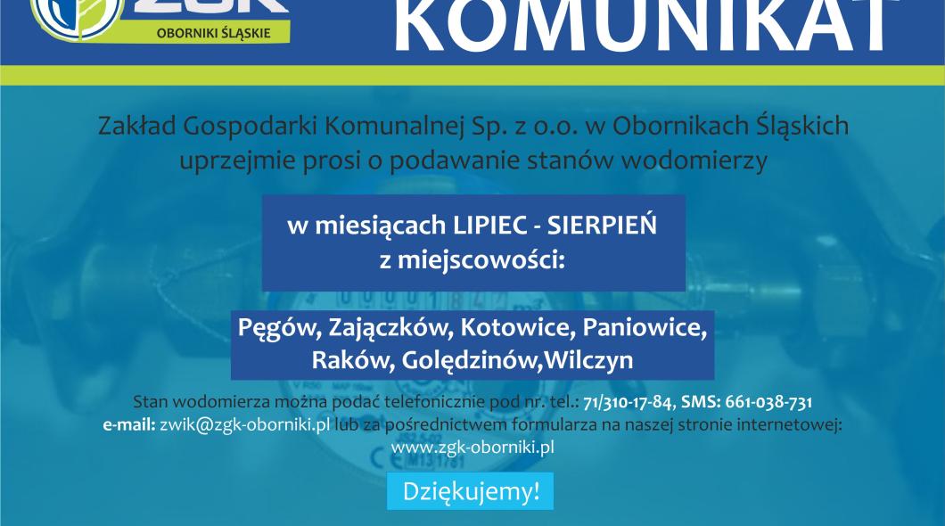 Zakład Gospodarki Komunalnej Sp. z o.o. w Obornikach Śląskich uprzejmie prosi o podawanie stanów wodomierzy w miesiącach Lipiec –Sierpień z miejscowości: