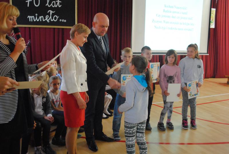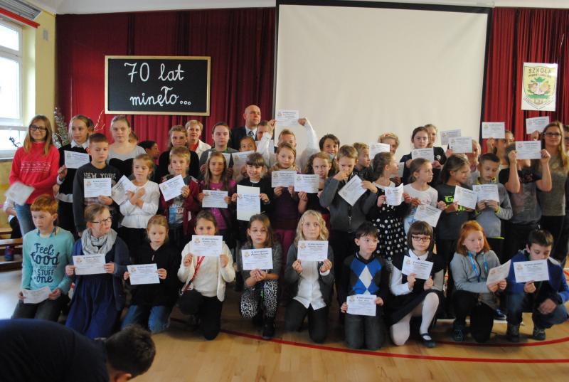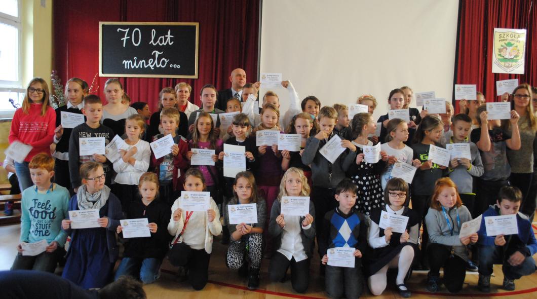 13 października odbyło się uroczyste wręczenie nagród laureatom konkursów zorganizowanych w ramach obchodów 70-lecia Szkoły Podstawowej nr 2 w Obornikach Śląskich. Po zaprezentowaniu bogatego programu artystycznego wykonanego przez uczniów szkoły, wręczenia dokonał Burmistrz Obornik Śląskich- Arkadiusz Poprawa wraz z koordynatorkami poszczególnych konkursów oraz Panią Dyrektor Szkoły Jolantą Dudczenko. Uczniowie mogli się sprawdzić aż w trzech konkursach dotyczących swojej szkoły. W konkursie poetyckim pt. „Moja Szkoła ma 70 lat” przygotowanym dla klas 1-3, wzięło udział 13 uczniów. Organizatorzy przyznali trzy I miejsca. Zdobyły je: Aleksandra Raduchowska , Maja Laskowska oraz Izabella Kociemba.