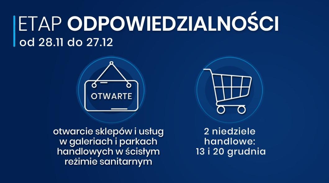 Utrzymująca się wysoka liczba zachorowań na COVID-19 nie pozwala na daleko idące znoszenie restrykcji i ograniczeń. Od 28 listopada wraca możliwość funkcjonowania sklepów i usług w galeriach i parkach handlowych w ścisłym reżimie sanitarnym. W sklepach i galeriach handlowych będzie obowiązywał limit osób – maksymalnie 1 os. na 15 m2.