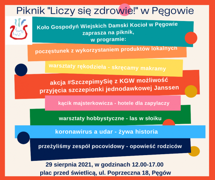 Koło Gospodyń Wiejskich "Damski Kocioł" w Pęgowie zaprasza na piknik "Liczy się zdrowie", który odbędzie się 29 sierpnia 2021 w godzinach 12-17 przed świetlicą wiejską w Pęgowie. W programie organizatorzy przewidzieli wiele atrakcji m.in.: akcja szczepimy się, kącik majsterkowicza, poczęstunek i wiele innych.