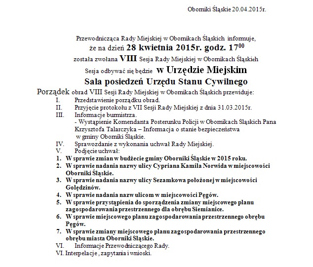 Program VIII Sesji Rady Miejskiej - 28 kwietnia 2015r. | Oficjalny serwis Gminy Oborniki Śląskie
