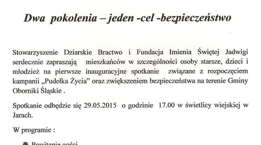 Stowarzyszenie Klub Seniora Dziarskie Bractwo i Fundacja Imienia Świętej Jadwigi serdecznie zapraszają   mieszkańców w szczególności osoby starsze, dzieci i młodzież na pierwsze inauguracyjne spotkanie  związane z rozpoczęciem kampanii „Pudełka Życia” oraz zwiększeniem bezpieczeństwa na terenie Gminy Oborniki Śląskie .
