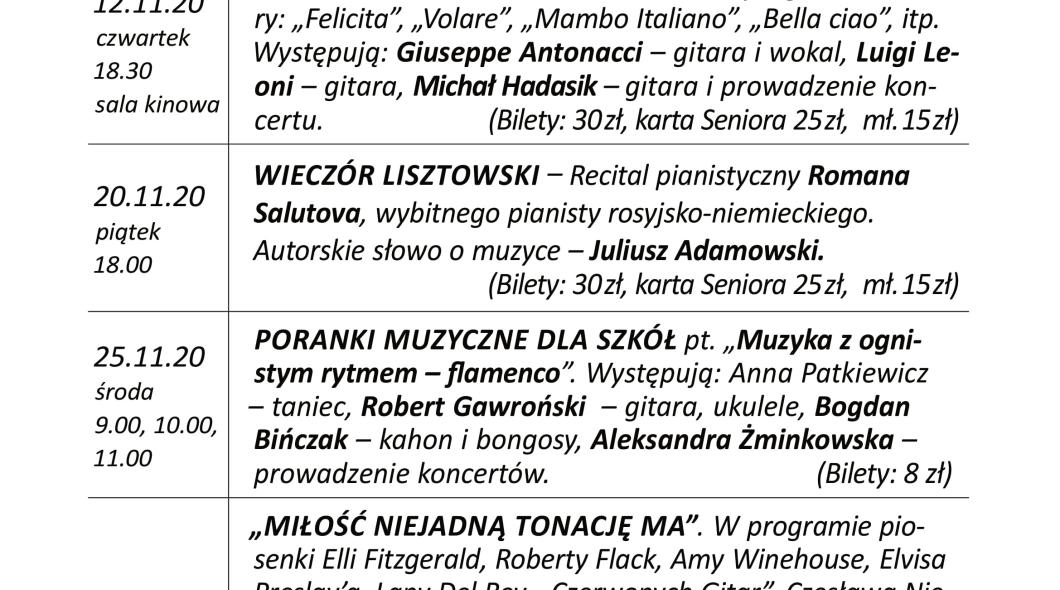 Listopad już za pasem. Zatem przedstawiamy Państwu nowy repertuar Saloniku. Dla widzów został przygotowany m.in. koncert przebojów włoskich, wieczór Lisztowski, poranki muzyczne dla szkół, czy wystawa "Magdalena Wosik. Kilka Plakatów", która będzie dostępna przez cały miesiąc. Przypominamy, że bilety na koncerty można nabyć w kasie Kina Astra.