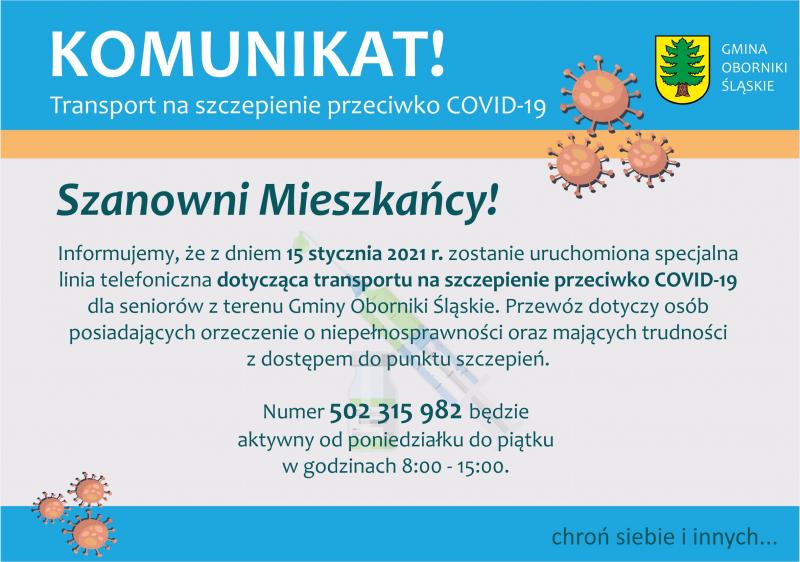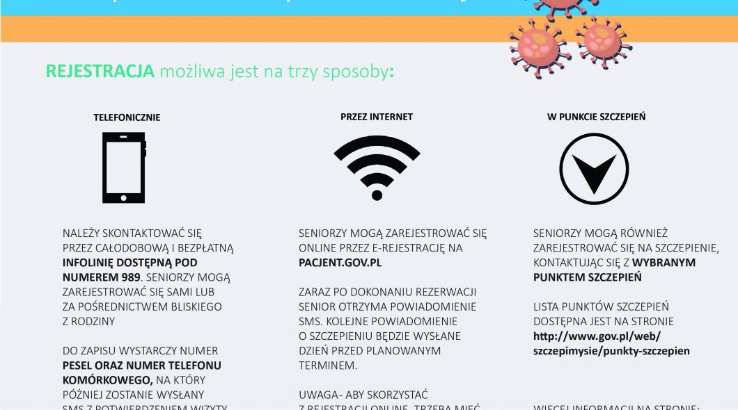 Od 15 stycznia na szczepienia przeciw COVID-19 mogą się umawiać seniorzy, którzy ukończyli 80. rok życia. Od 22 stycznia ruszą zapisy dla seniorów, którzy ukończyli 70 lat. Szczepienia rozpoczną się 25 stycznia. Przypominamy, że od 15 stycznia została uruchomiona specjalna linia telefoniczna dotycząca transportu na szczepienia dla seniorów z orzeczeniem o niepełnosprawności oraz mających trudności z dostępem do punktu szczepień.