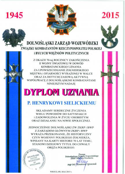 12 maja w klubie IV Regionalnej Bazy Logistycznej odbyła się uroczystość poświęcona 70. rocznicy zakończenia II Wojny Światowej. Imprezę zroganizował Dolnośląski Zarząd Wojewódzki Związku Kombatantów Rzeczypospoliteh Polskiej i Byłych Więźniów Politycznych. Podczas uroczystości pan Henryk Sielicki - prezes Związku Kombatantów RP w Obornikach Śląskich odebrał Dyplom Uznania za upowrzechnianie męstwa i ofiarności wyrażonej w walce oraz dotychczasową aktywną współpracę z Dolnośląskimi Kombatantami. Uroczystość została wzbogacona występem zespołu artystycznego, chóru złożonego z uczniów naszej Szkoły Podstawowej nr 3 - pod kierunkiem pani Marcinkowskiej Joanny, który zebrał owacje na stojąco od gości konferencji. Gminę Oborniki Śląskie reprezentowali: Zastępca Burmistrza Henryk Cymerman, Dyrektor OOK Halina Muszak, przedstawiciel związku kombatantów pan Ryszard Chwaliński oraz pan Andrzej Łakomski, nauczyciel ze szkoły w Pęgowie.