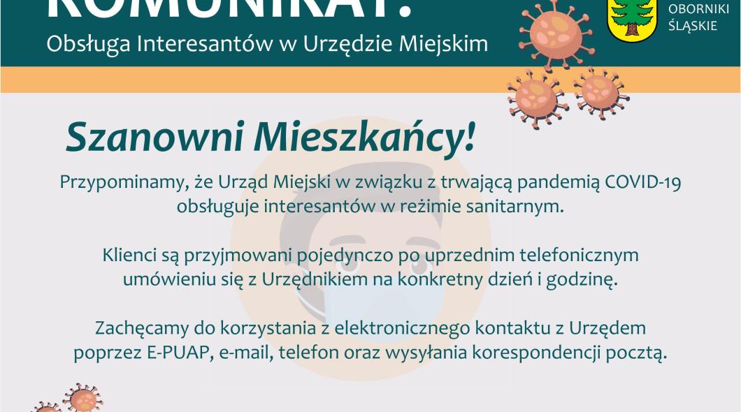 Przypominamy, że Urząd Miejski w związku z trwającą pandemią COVID-19 obsługuje interesantów w reżimie sanitarnym.Klienci są przyjmowani pojedynczo po uprzednim telefonicznym umówieniu się z Urzędnikiem na konkretny dzień i godzinę. Zachęcamy do korzystania z elektronicznego kontaktu z Urzędem poprzez E-PUAP, e-mail, telefon oraz wysyłania korespondencji pocztą.