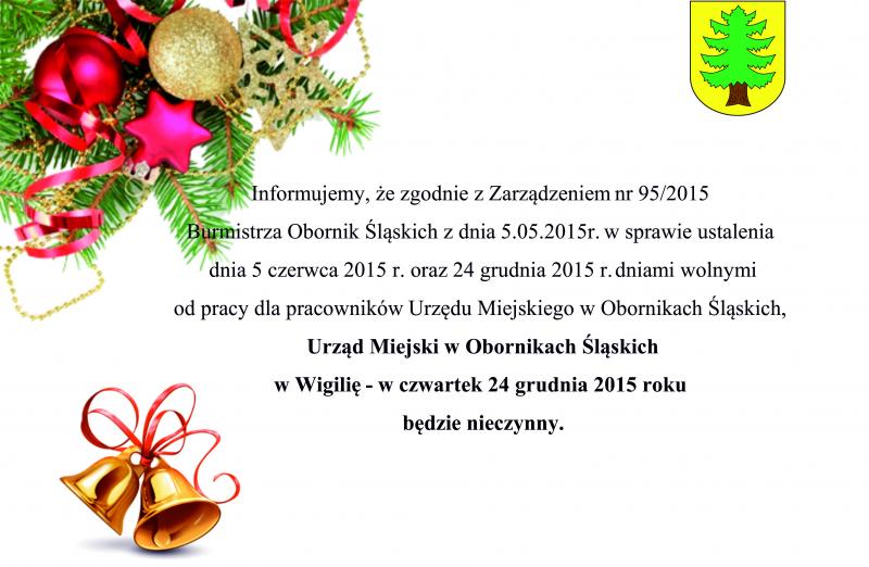 Urząd Miejski w Obornikach Śląskich 24 grudnia 2015 roku będzie nieczynny!