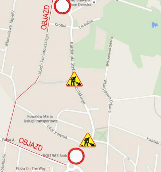 Jednocześnie informujemy o planowanym na początek lipca zamknięciu drogi powiatowej (ul. Wyszyńskiego) na odcinku od ronda do ul. Sikorskiego, objazd dla pojazdów osobowych przez ul. Poniatowskiego dla ciężarowych przez Prusice. Planowana długość wyłączenia z ruchu 3 dni. Dokładny termin wyłączenia podamy w ostatnim tygodniu czerwca. W załączeniu mapa z zaznaczonym objazdem dla samochodów osobowych.