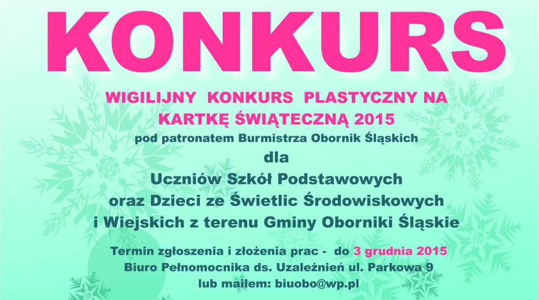 Burmistrz Obornik Śląskich ogłasza „Wigilijny Konkurs  Plastyczny  na Kartkę Świąteczną 2015 r.”. Konkurs skierowany jest do dzieci w wielku do 13 roku życia. Termin nadsyłania zgłoszeń 3.12.2015. Regulamin, karta zgłoszeniowa oraz oświadczenie do pobrania poniżej.