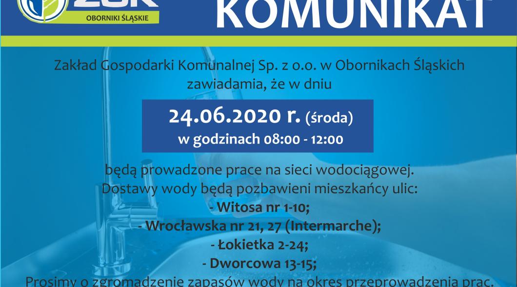Zakład Gospodarki Komunalnej Sp. z o.o. w Obornikach Śląskich zawiadamia, że w dniu 26.06.2020 r. (środa) w godzinach od 08:00 do 12:00.