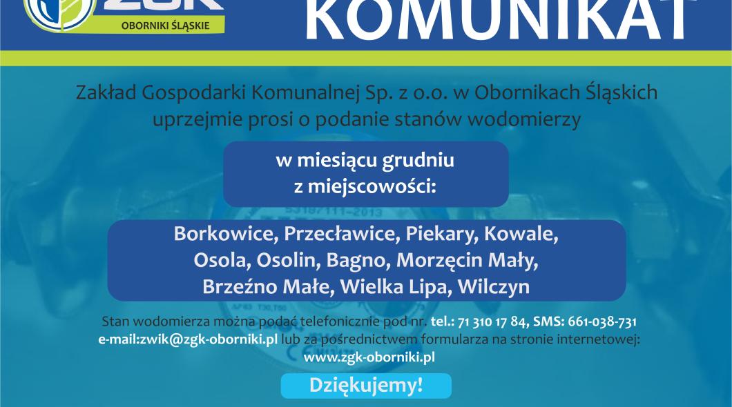 Zakład Gospodarki Komunalnej prosi o podanie stanów wodomierzy w grudniu br. z miejscowości: