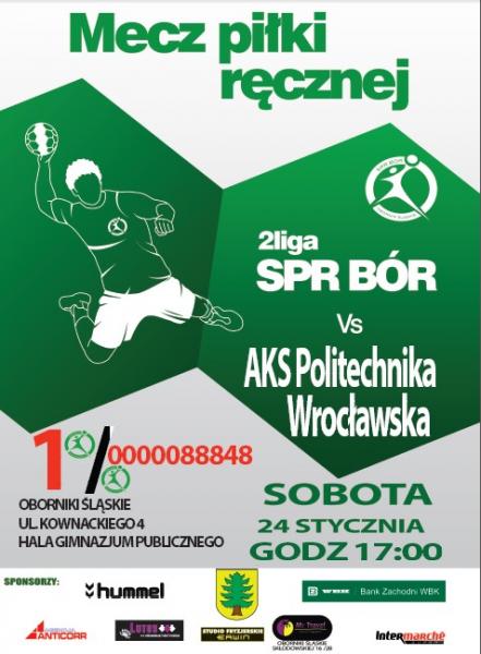 Zapraszamy na kolejny mecz SPR BÓR OBORNIKI ŚLĄSKIE. Tym razem na własnym parkiecie nasi piłkarze ręczni podejmą AKS POLITECHNIKĘ WROCŁAWSKĄ. Najbliższa Sobota 24.01.2015r. godzina. 17.00 Zapraszamy !!!