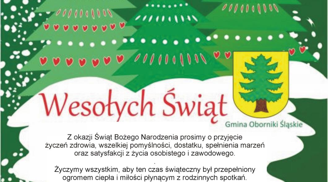 Wszystkim mieszkańcom oraz sympatykom Gminy Oborniki Śląskie życzymy zdrowych i pogodnych Świąt Bożego Narodzenia. Niech ten czas spędzony w gronie najbliższych napełni Wasze serca spokojem i radością.