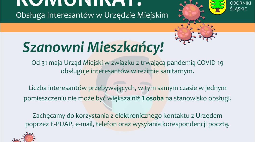 Od 31 maja Urząd Miejski w związku z trwającą pandemią COVID-19 obsługuje interesantów w reżimie sanitarnym. Liczba interesantów przebywających, w tym samym czasie w jednym pomieszczeniu nie może być większa niż 1 osoba na stanowisko obsługi. Zachęcamy do korzystania z elektronicznego kontaktu z Urzędem poprzez E-PUAP, e-mail, telefon oraz wysyłania korespondencji pocztą.