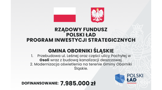 Projekt zakłada modernizację gminnego systemu oświetlenia drogowego i parkowego polegającą na wymianie starych opraw żarówkowych sodowych i rtęciowych na nowoczesne i energooszczędne oprawy led uzupełnione o system zdalnego sterowania z europejskimi standardami jakości ISO. Dodatkowo w miejscach gdzie brak jest oświetlenia wykonane zostanie nowe. Dzięki temu działaniu standard oświetlenia zostanie znacząco podniesiony nie tylko poprzez zmianę jakości światła ale również przez zmniejszenie awaryjności i częstotliwości akcji serwisowych służb energetycznych. Wymiana opraw na ledowe znacząco zmniejszy zużycie energii elektrycznej na potrzeby oświetlenia w gminie Oborniki Śląskie. Modernizacja przyczyni się jednocześnie do poprawy bezpieczeństwa i komfortu użytkowników dróg, przestrzeni publicznej, a także podkreśli walory estetyczne przestrzeni gminnej. Planujemy ogłosić przetarg na modernizację ok. 1 800 sztuk opraw oświetlenia starego typu, na nowe oprawy ledowe wraz z systemem sterowania.