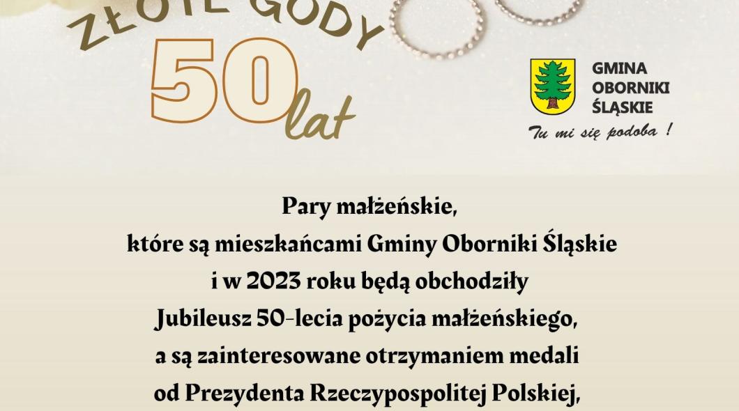 Pary małżeńskie, które są mieszkańcami Gminy Oborniki Śląskie i w 2023 roku będą obchodziły Jubileusz 50-lecia pożycia małżeńskiego, a są zainteresowane otrzymaniem medali od Prezydenta Rzeczypospolitej Polskiej, proszone są o kontakt z Urzędem Stanu Cywilnego w Obornikach Śląskich osobiście lub telefonicznie pod nr 71 310 35 19 w. 432 w godzinach pracy Urzędu tj. poniedziałek, wtorek, czwartek w godzinach od 7.30 do 15.30; środa od 7.30 do 17.00 oraz w piątek od 7.30 do 14.00