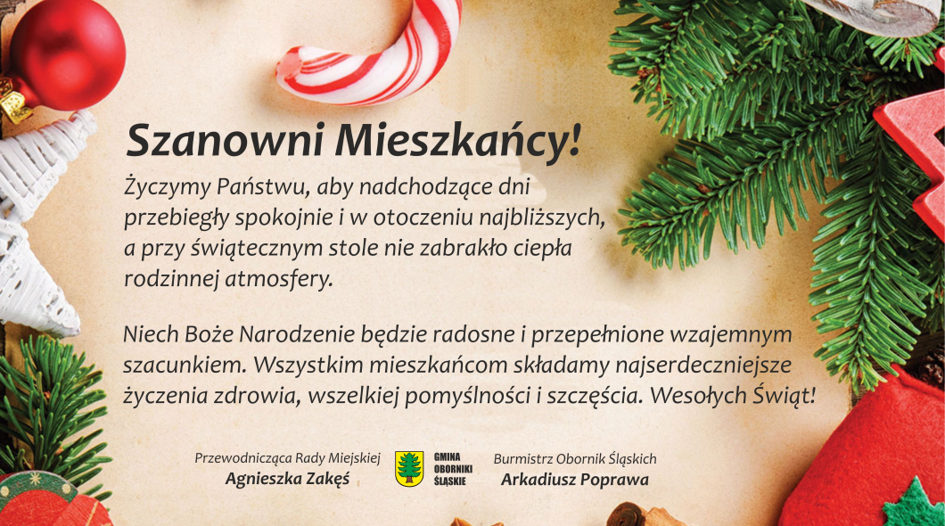 Życzymy Państwu, aby nadchodzące dni przebiegły spokojnie i w otoczeniu najbliższych, a przy świątecznym stole nie zabraknie ciepła rodzinnej atmosfery. Niech Boże Narodzenie będzie radosne i przepełnione wzajemnym szacunkiem. Wszystkim Mieszkańcom składamy najserdeczniejsze życzenia zdrowia, wszelkiej pomyślności i szczęścia! Wesołych Świąt!